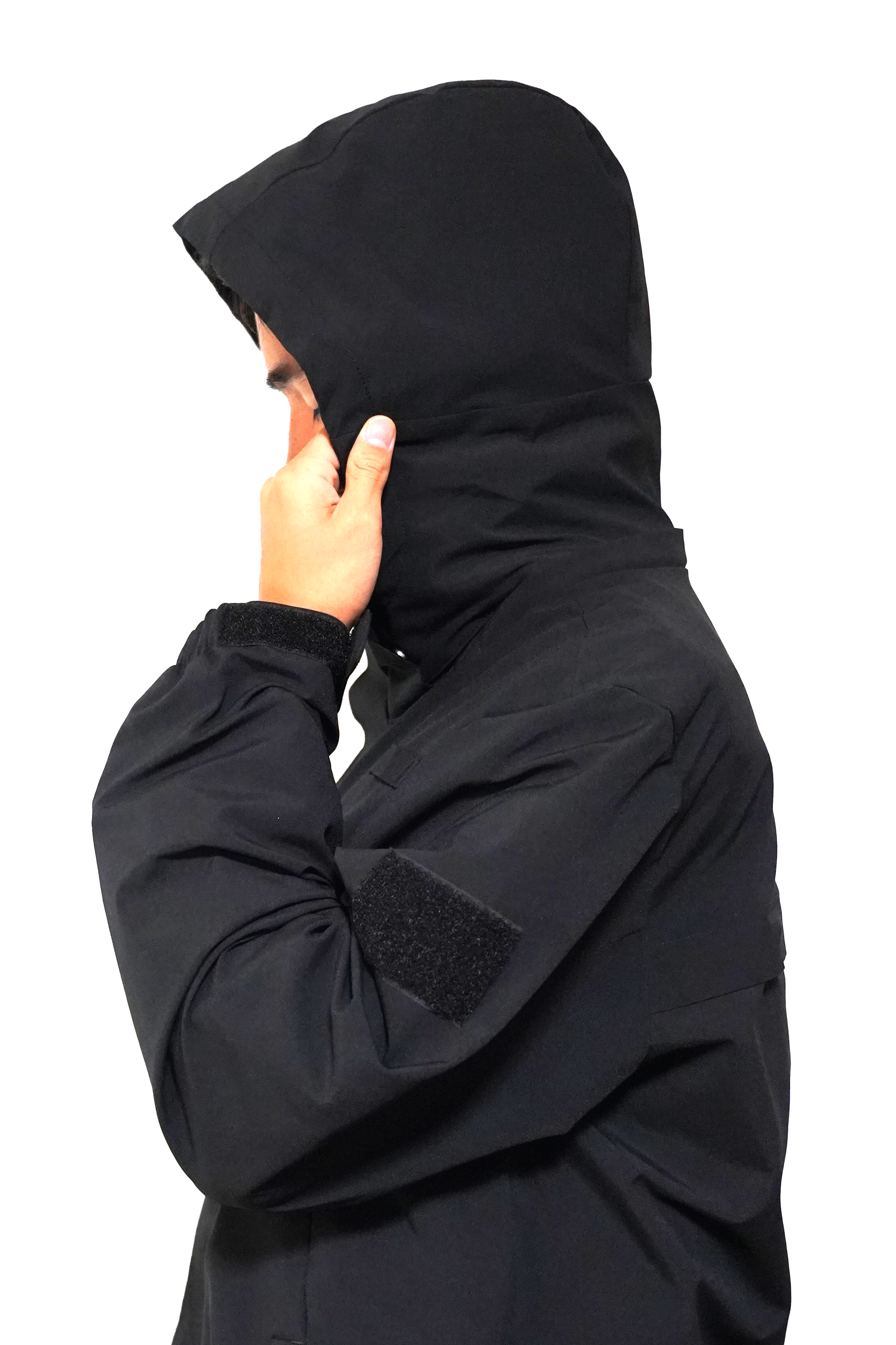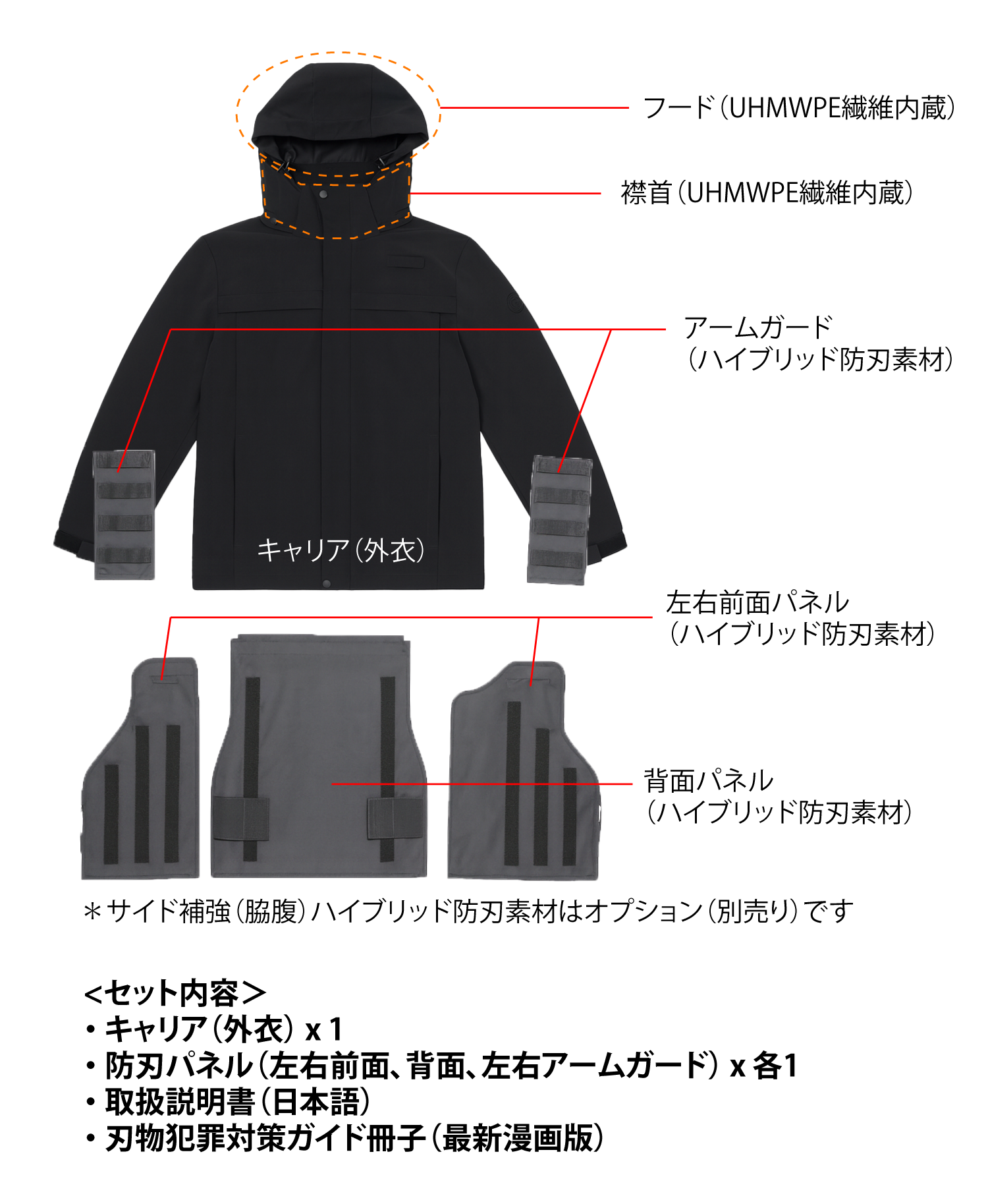 体幹部には強力な刺突にも耐えるハイブリッド防刃パネルを内蔵し、特に要望の多かった頸部・頭部には、可動性と軽量性を優先してUHMWPE防刃繊維を厚層配置しています。さらに前腕部には、攻撃を防ぎつつ次の行動につなげるためのアームガードを搭載。撥水・防風性能やワッペン装着機能など、業務・日常の双方で使える拡張性も備えています。